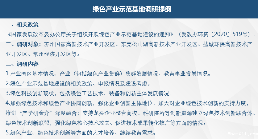 对东莞松山湖高新技术产业开发区等5个绿色产业示范基地建设进行书面调研并形成调研报告,研究在构建绿色技术创新体系中,高校及科研院所发挥的作用,推进“产学研金介”深度融合情况,绿色产业、绿色技术创新等方面的人才培养。