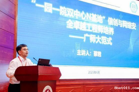 广东技术师范大学网络空间安全学院院长、青年珠江学者蔡君教授作“‘一园一院双中心N基地’信创与网络安全卓越工程师培养——广师大范式”主题报告 。报告分为学校介绍、信创部署、取得的成效等三部分,详细介绍了“一园一院双中心N基地”的具体做法。其中“一园”指信创与网络安全省级大学科技园,“一院”指成立网络空间安全学院,“双中心”指广东省教育行业信创适配中心、广东省教育行业网络靶场与实网攻防演练中心,“N 基地”指产教融合基地。学校在实践探索中取得了良好成效,教师团队科研成果丰硕,学生多次获奖。