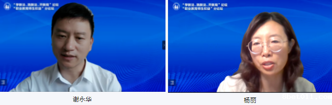 顺丰集团招聘总监周文博、新道科技股份有限公司教育服务事业部总经理何胜利作为企业代表,在“企业谈师生权益”板块作主题发言。两位企业代表深入交流了新修订的职业教育法对行业企业的启示和指引,并从校企合作模式、人才培养路径、岗位技能培训、就业质量提升等方面,分享了企业保障职业教育师生权益的经验做法。