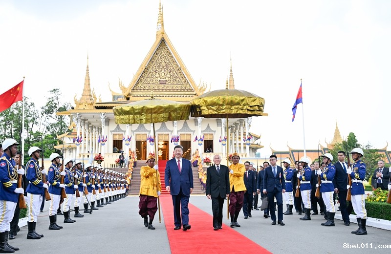 4月17日下午,柬埔寨国王西哈莫尼同中国国家主席习近平在金边王宫举行会见。这是会见后,两国元首步出金边王宫。新华社记者 殷博古 摄