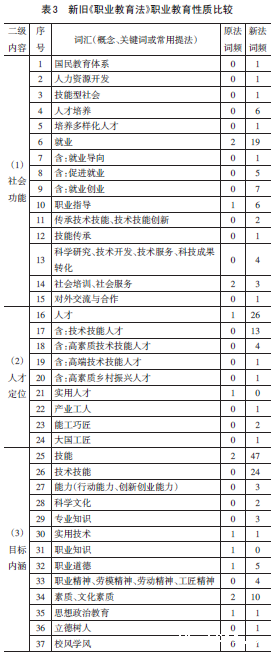 职业教育性质通过教育功能定位、人才培养定位、教育目标定位来反映。新《职业教育法》涉及职业教育功能、人才培养定位、教育目标内涵的词汇有37个,新出现26个,占70%(表3),反映出新《职业教育法》在拓展职业教育功能、提升人才培养定位、突出类型教育内涵特征的立法意图。