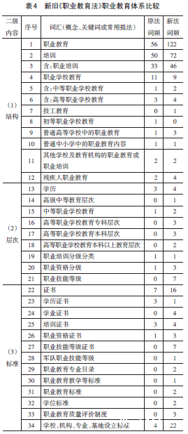 新《职业教育法》、原《职业教育法》都将“职业教育体系”单列一章并放在第二章,体现出职业教育体系建设的重要性。从结构、层次、标准、规则、布局等五个方面来认识新《职业教育法》建构的职业教育体系,共收集相关词汇59个,其中新词汇30个,占51%(表4),反映了职业教育体系的现代性、包容性、系统性、适应性特点。
