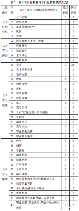 新《职业教育法》出现不少有关职业教育经验特色、育人理论、育人载体、育人模式等方面的内容和提法,描绘了中国特色职业教育模式。研究共收集相关词汇40个,新词汇32个,占80%(表5),反映出新《职业教育法》坚持马克思主义实践观,及时将我国职业教育改革实践成果和理论认识上升为法律规定的立法意图,是本次修法的重要创新。