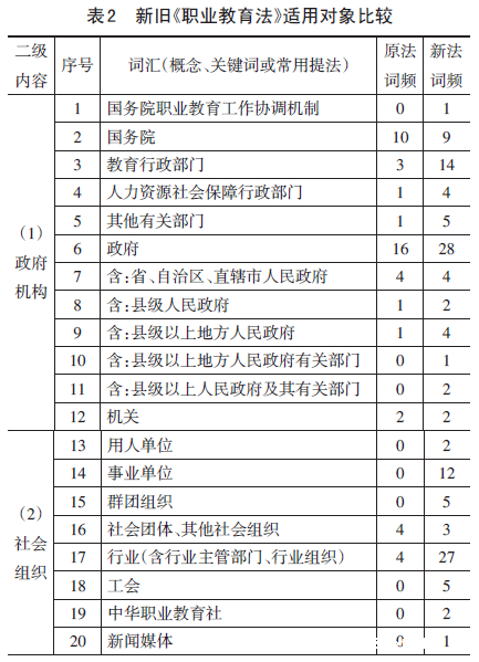 新《职业教育法》适用对象涵盖了承担统筹管理责任的政府机构、负有参与指导等义务的社会组织、职业教育和培训实施机构、职业教育活动参加人员等4个二级内容。新《职业教育法》涉及该内容的词汇有53个,比原《职业教育法》增加24个,新词汇占45%(表2),反映出强化政府责任、加强分级管理、重视行业指导、鼓励社会参与以及构建职教发展大格局的立法指向。